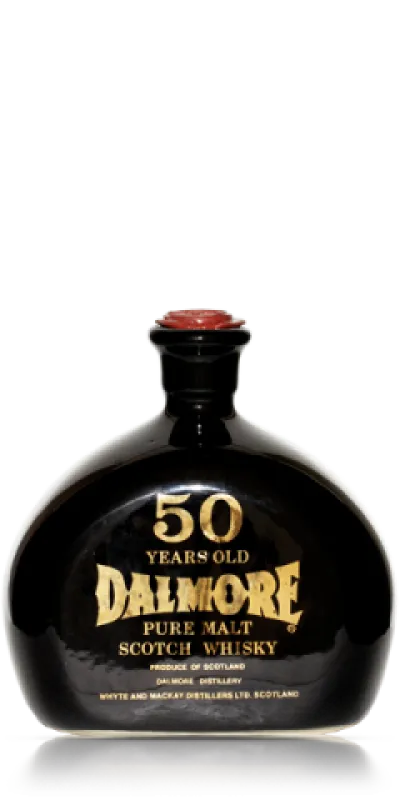 Pure Malt. Black dumpy ceramic decanter. Driven cork closure with red stags head embossed wax seal. Text and Dalmore logo in gilt. Accompanied by black ceramic topped cork stopper. In either a purple felt cardboard presentation case or a wooden presentation box with leather hinges and clasp. |
